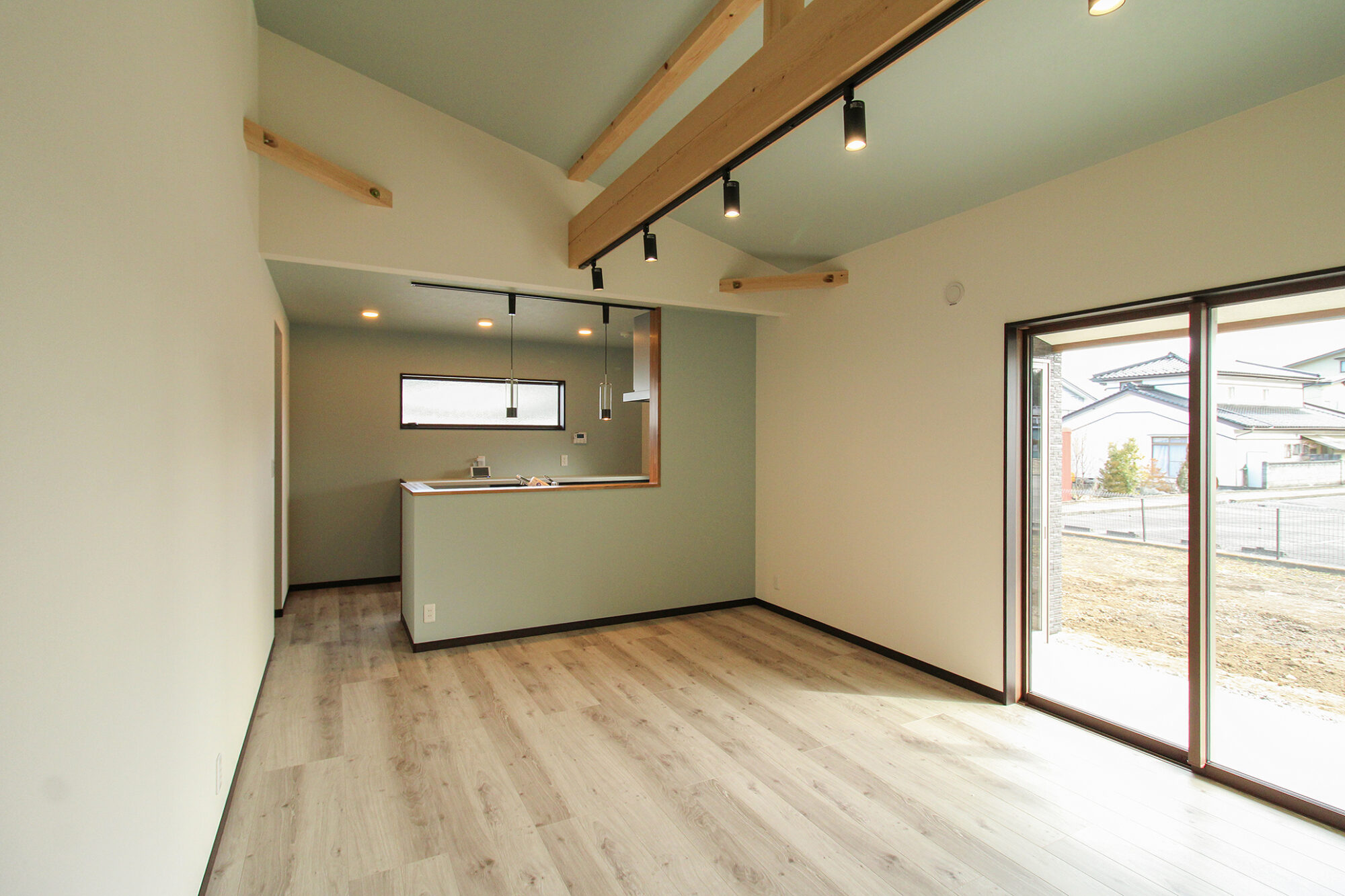 キッチンに立つと、開放的なLDKが一望できる間取り。家族の気配を感じながら料理ができる安心感と、天井の梁や照明が空間に心地よいリズムを生み出しています。