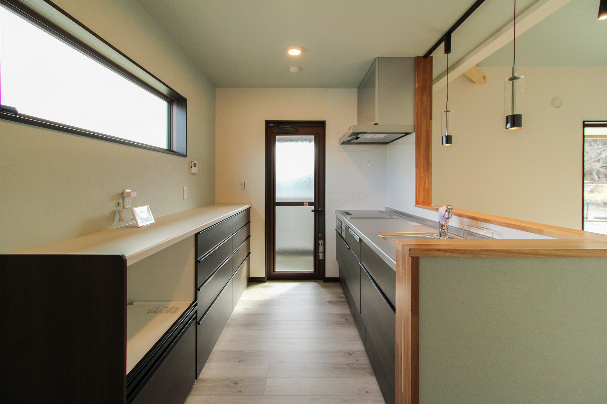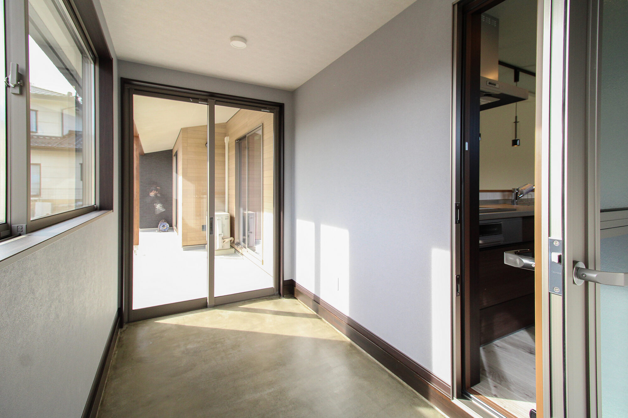 キッチン横につながる明るい土間スペース。外と内をゆるやかにつなぐ場所として、洗濯や収納、趣味の作業にも活躍。暮らしの幅を広げてくれる便利な空間です。